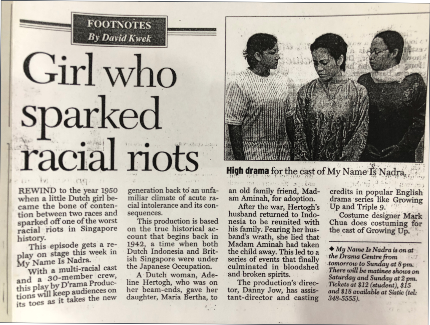 In 2000, the then D'rama Production, staged the powerful piece entitled My Name is Nadra, that opened 9th Nov at the Drama Centre. In 1937, the Hertoghs gave birth to Maria in Java. Five years later, with Mr Hertogh imprisoned by the Japanese, his wife gave Maria to a Malay family friend, Aminah.